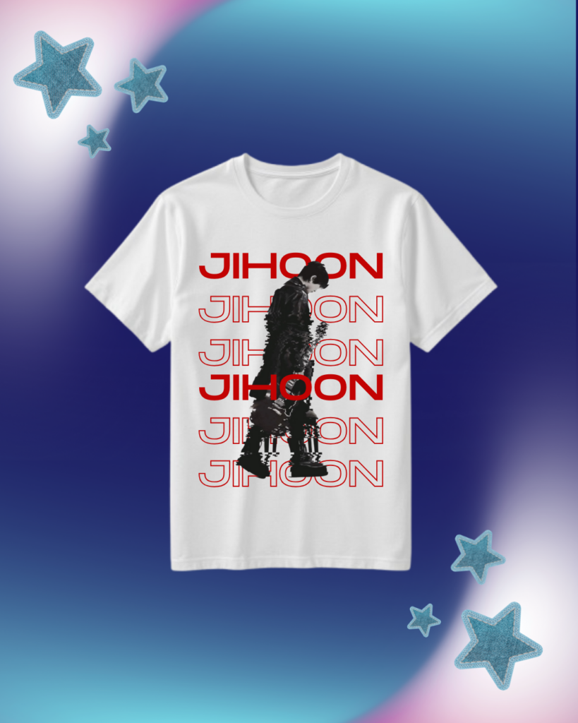 Contoh nyata dari penerapan branding L2K dapat dilihat dari desain kaos yang mereka produksi. Pada foto pertama, terlihat kaos dengan tampilan idol dan tipografi besar yang menjadi pusat perhatian. Desain ini menunjukkan keberanian L2K menempatkan figur idola sebagai ikon utama, sehingga konsumen langsung mengenali konsep produknya sebagai merchandise fashion K-Pop yang modern.